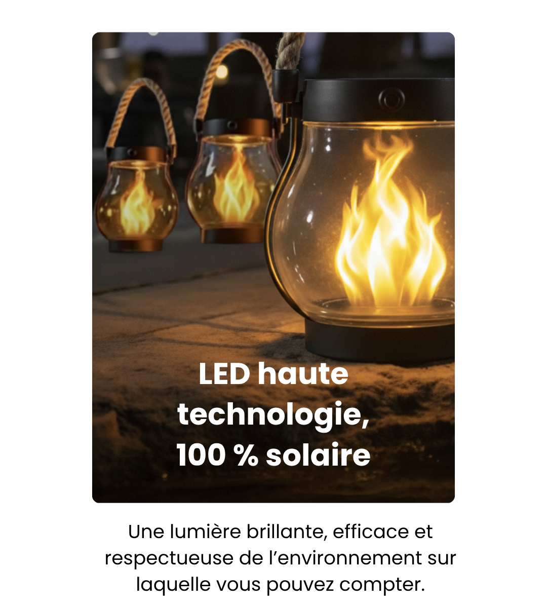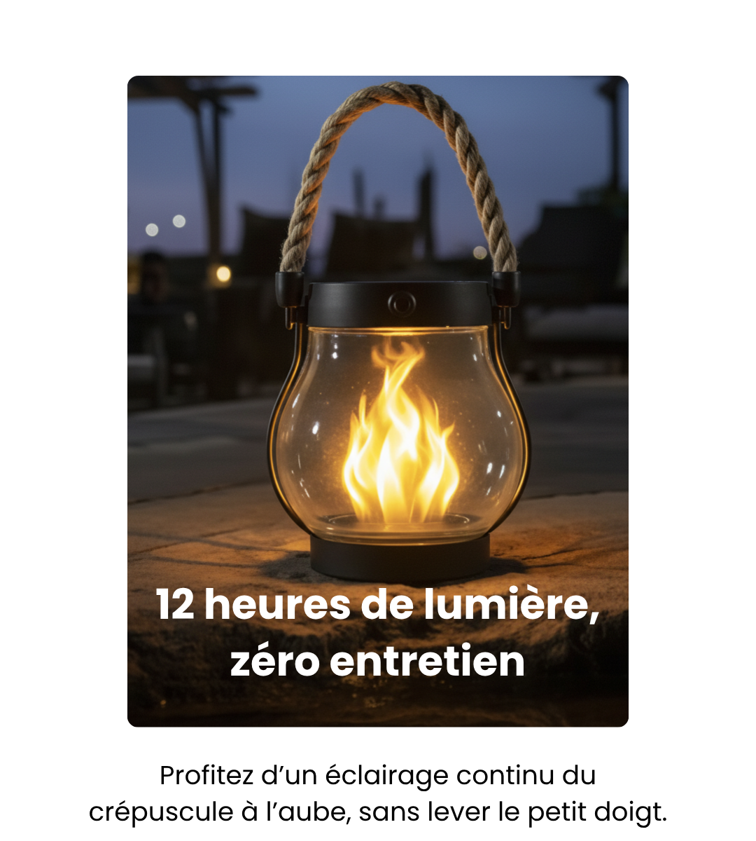 Elle se recharge automatiquement grâce à la lumière du soleil pendant la journée. Une fois la nuit tombée, elle s’allume seule grâce à son capteur de luminosité intégré — aucun câble ni bouton à manipuler.
