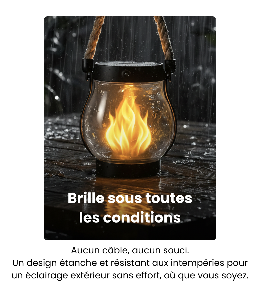 Oui, la lampe est étanche (IP65). Elle résiste à la pluie, au vent et à la chaleur, vous pouvez donc la laisser dehors toute l’année sans souci.